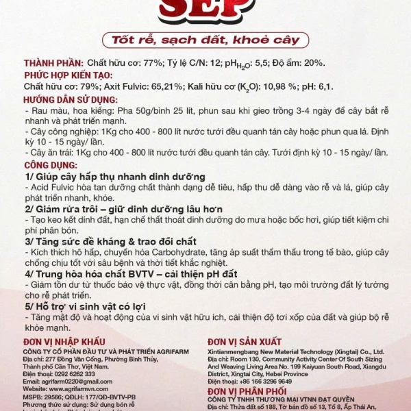 Thành phần: chất Hữu Cơ 77 %, axit Fuvid 65.21 %, a xit Hữu Cơ 10.98 %. Ph 6,1%.